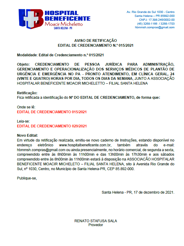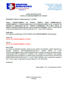 Objeto: CREDENCIAMENTO DE PESSOA JURÍDICA PARA ADMINISTRAÇÃO, GERENCIAMENTO E OPERACIONALIZAÇÃO DOS SERVIÇOS MÉDICOS DE PLANTÃO DE URGÊNCIA E EMERGÊNCIA NO PA – PRONTO ATENDIMENTO, EM CLÍNICA GERAL, 24 (VINTE E QUATRO) HORAS POR DIA, TODOS OS DIAS DA SEMANA, JUNTO A ASSOCIAÇÃO HOSPITALAR BENEFICENTE MOACIR MICHELETTO – FILIAL SANTA HELENA