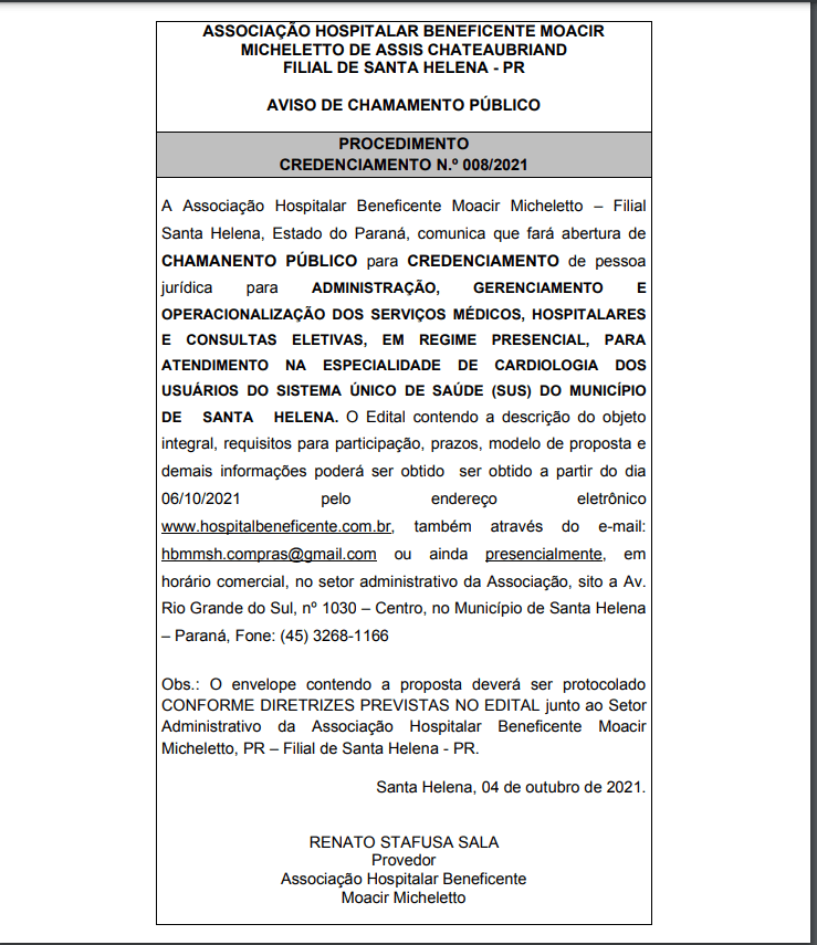 Santa Helena, Estado do Paraná, comunica que fará abertura de
