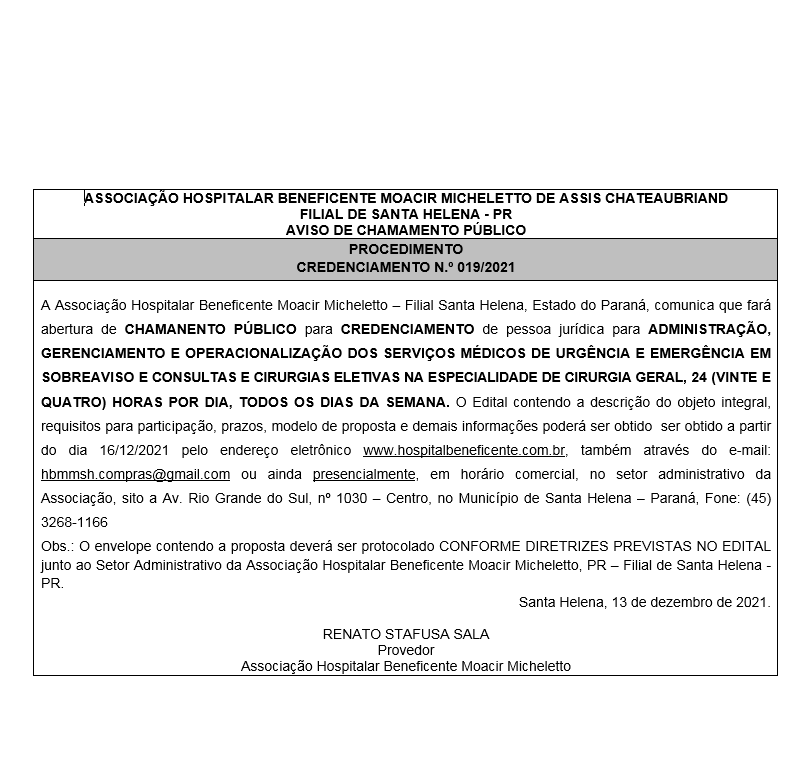 A Associação Hospitalar Beneficente Moacir Micheletto – Filial Santa Helena, Estado do Paraná, comunica que fará abertura de CHAMANENTO PÚBLICO para CREDENCIAMENTO de pessoa jurídica para ADMINISTRAÇÃO, GERENCIAMENTO E OPERACIONALIZAÇÃO DOS SERVIÇOS MÉDICOS DE URGÊNCIA E EMERGÊNCIA EM SOBREAVISO E CONSULTAS E CIRURGIAS ELETIVAS NA ESPECIALIDADE DE CIRURGIA GERAL, 24 (VINTE E QUATRO) HORAS POR DIA, TODOS OS DIAS DA SEMANA. O Edital contendo a descrição do objeto integral, requisitos para participação, prazos, modelo de proposta e demais informações poderá ser obtido ser obtido a partir do dia 16/12/2021 pelo endereço eletrônico www.hospitalbeneficente.com.br, também através do e-mail: hbmmsh.compras@gmail.com ou ainda presencialmente, em horário comercial, no setor administrativo da Associação, sito a Av. Rio Grande do Sul, nº 1030 – Centro, no Município de Santa Helena – Paraná, Fone: (45) 3268-1166