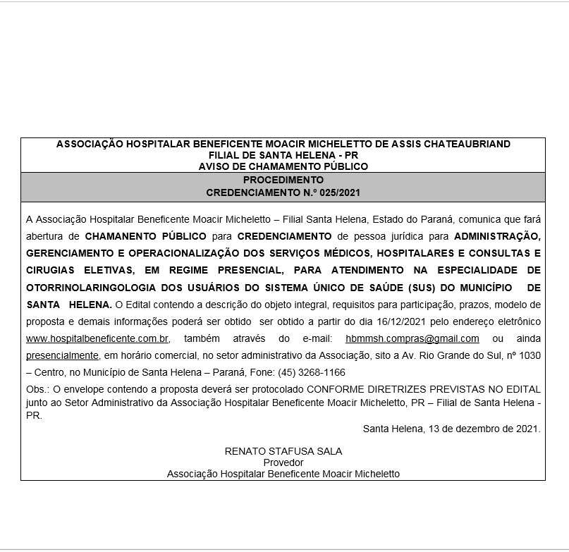 A Associação Hospitalar Beneficente Moacir Micheletto – Filial Santa Helena, Estado do Paraná, comunica que fará abertura de CHAMANENTO PÚBLICO para CREDENCIAMENTO de pessoa jurídica para ADMINISTRAÇÃO, GERENCIAMENTO E OPERACIONALIZAÇÃO DOS SERVIÇOS MÉDICOS, HOSPITALARES E CONSULTAS E CIRUGIAS ELETIVAS, EM REGIME PRESENCIAL, PARA ATENDIMENTO NA ESPECIALIDADE DE OTORRINOLARINGOLOGIA DOS USUÁRIOS DO SISTEMA ÚNICO DE SAÚDE (SUS) DO MUNICÍPIO DE SANTA HELENA. O Edital contendo a descrição do objeto integral, requisitos para participação, prazos, modelo de proposta e demais informações poderá ser obtido ser obtido a partir do dia 16/12/2021 pelo endereço eletrônico www.hospitalbeneficente.com.br, também através do e-mail: hbmmsh.compras@gmail.com ou ainda presencialmente, em horário comercial, no setor administrativo da Associação, sito a Av. Rio Grande do Sul, nº 1030 – Centro, no Município de Santa Helena – Paraná, Fone: (45) 3268-1166
