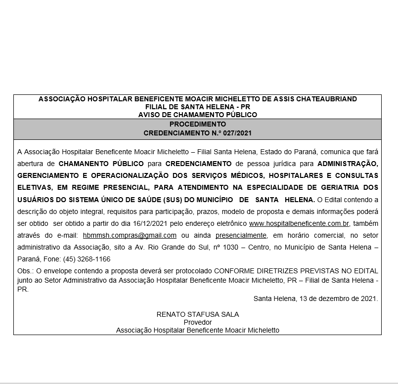 A Associação Hospitalar Beneficente Moacir Micheletto – Filial Santa Helena, Estado do Paraná, comunica que fará abertura de CHAMANENTO PÚBLICO para CREDENCIAMENTO de pessoa jurídica para ADMINISTRAÇÃO, GERENCIAMENTO E OPERACIONALIZAÇÃO DOS SERVIÇOS MÉDICOS, HOSPITALARES E CONSULTAS ELETIVAS, EM REGIME PRESENCIAL, PARA ATENDIMENTO NA ESPECIALIDADE DE GERIATRIA DOS USUÁRIOS DO SISTEMA ÚNICO DE SAÚDE (SUS) DO MUNICÍPIO DE SANTA HELENA. O Edital contendo a descrição do objeto integral, requisitos para participação, prazos, modelo de proposta e demais informações poderá ser obtido ser obtido a partir do dia 16/12/2021 pelo endereço eletrônico www.hospitalbeneficente.com.br, também através do e-mail: hbmmsh.compras@gmail.com ou ainda presencialmente, em horário comercial, no setor administrativo da Associação, sito a Av. Rio Grande do Sul, nº 1030 – Centro, no Município de Santa Helena – Paraná, Fone: (45) 3268-1166